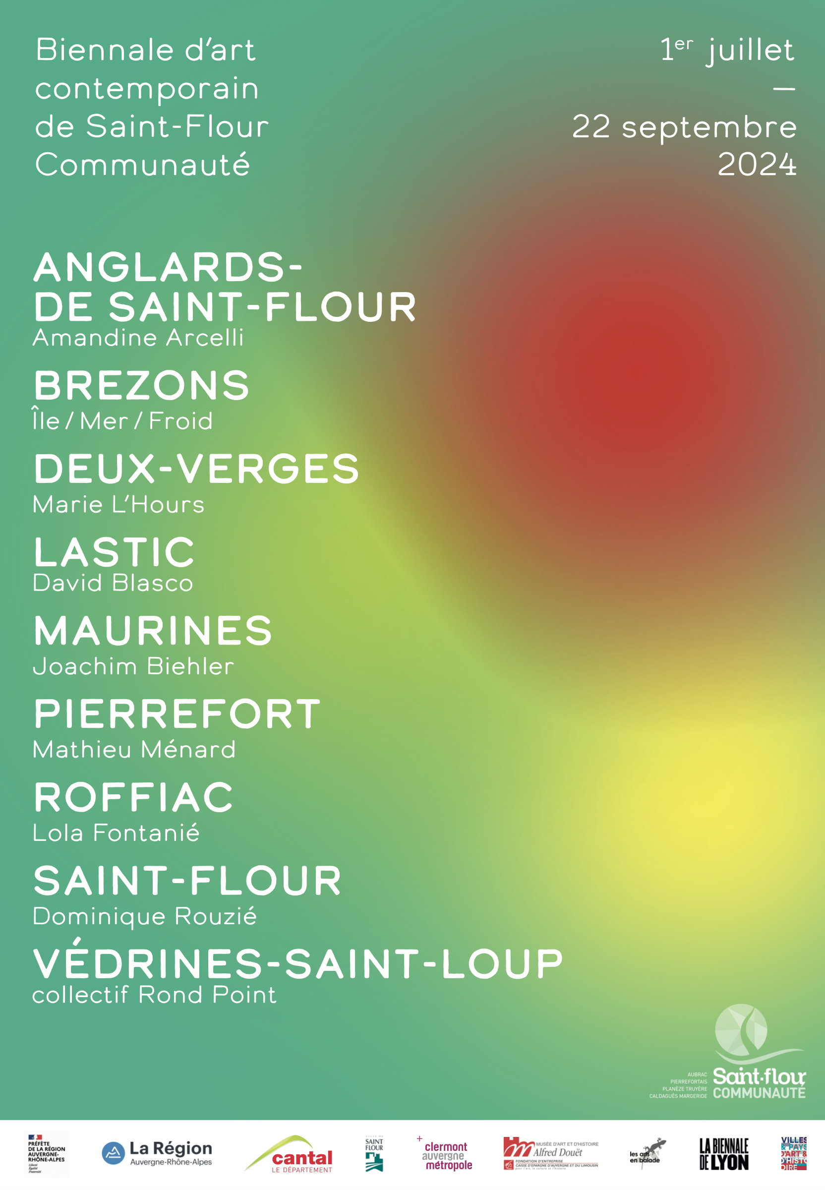 Pour son édition 2024, la Biennale d’art contemporain de Saint-Flour Communauté rassemble 9 artistes pour des créations en situation, sur 9 communes, avec l’ambition d’une proximité entre artistes, œuvres et publics.